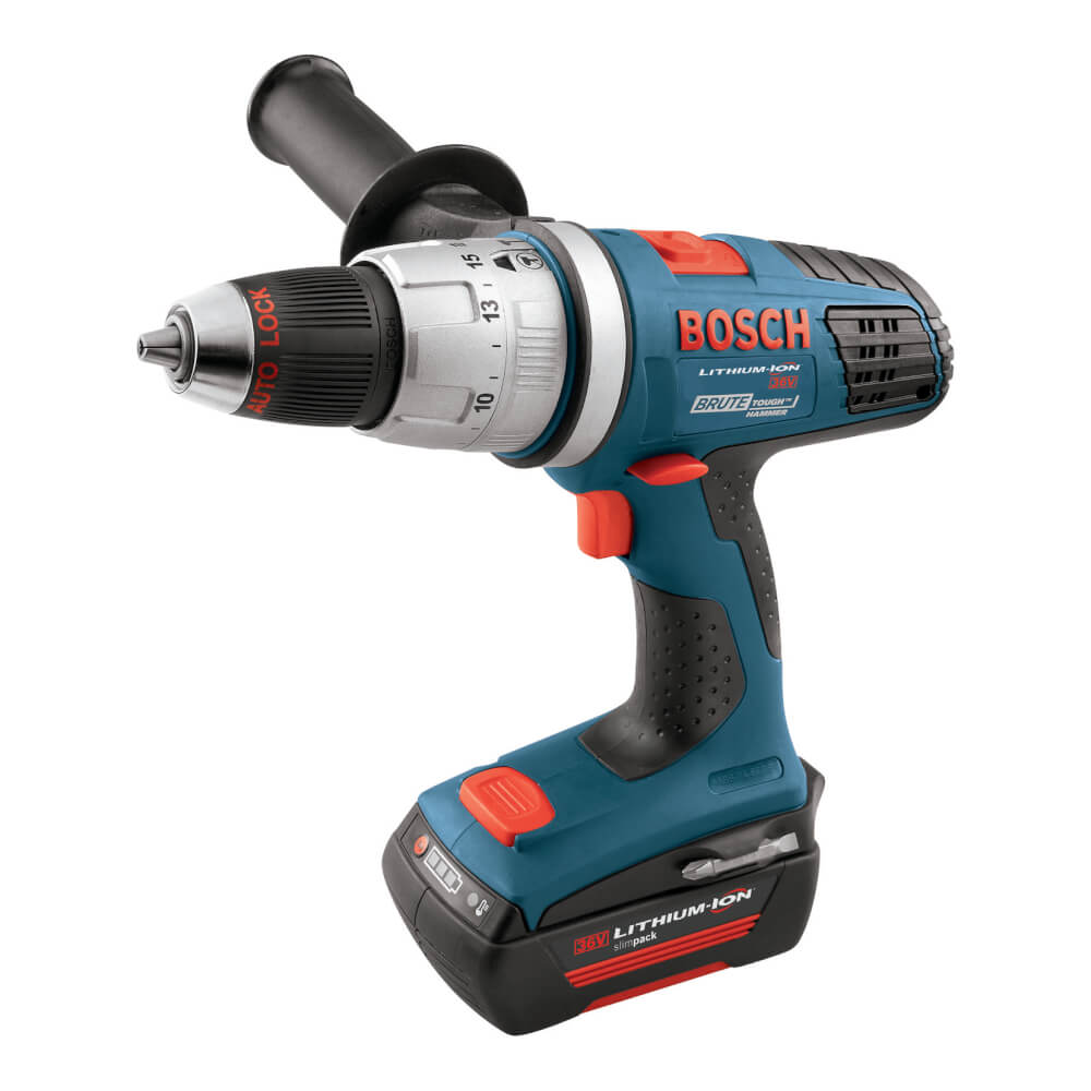 The Bosch 36 V Brute Tough™ hammer drill/driver features a unibody powertrain, keeping gears in alignment for the most durable drive train on the market. Steel reinforced collar provides enhanced durability when dropped on the chuck.