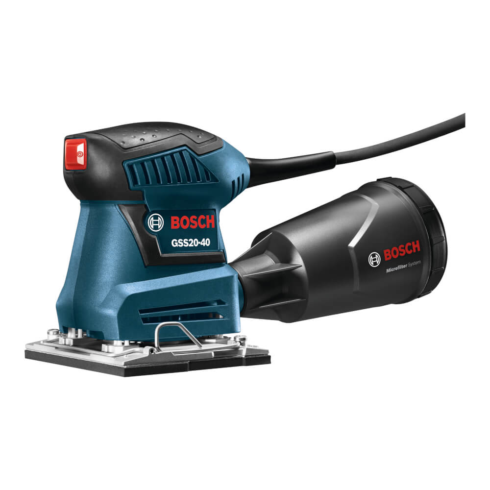 The Bosch GSS20-40 1/4-Sheet Orbital Finishing Sander delivers even sanding and long tool life, with a precision-machined aluminum sanding plate. It has a beefy 2.0-amp motor that produces up to 12,000 oscillations per minute (OPM), delivering uniform and smooth results on all surfaces. This tool incorporates low-vibration engineering for user comfort and for enhanced tool life. It features the traditional sanding sheet clamp design, for dependable grip of one or more sanding sheets (it also accepts stick-on paper). Ideal for finish carpenters and other pro users, the GSS20-40 features through-the-pad dust collection and a microfilter dust canister with screw-off cap. An integrated paper filter in the canister traps particles as small as 1/2 micron. The sander offers flush sanding, so the user can sand along the edges of vertical surfaces on three sides, for uniform sanding throughout the workpiece. The tool also provides an ergonomic soft-grip top for control and user comfort.
