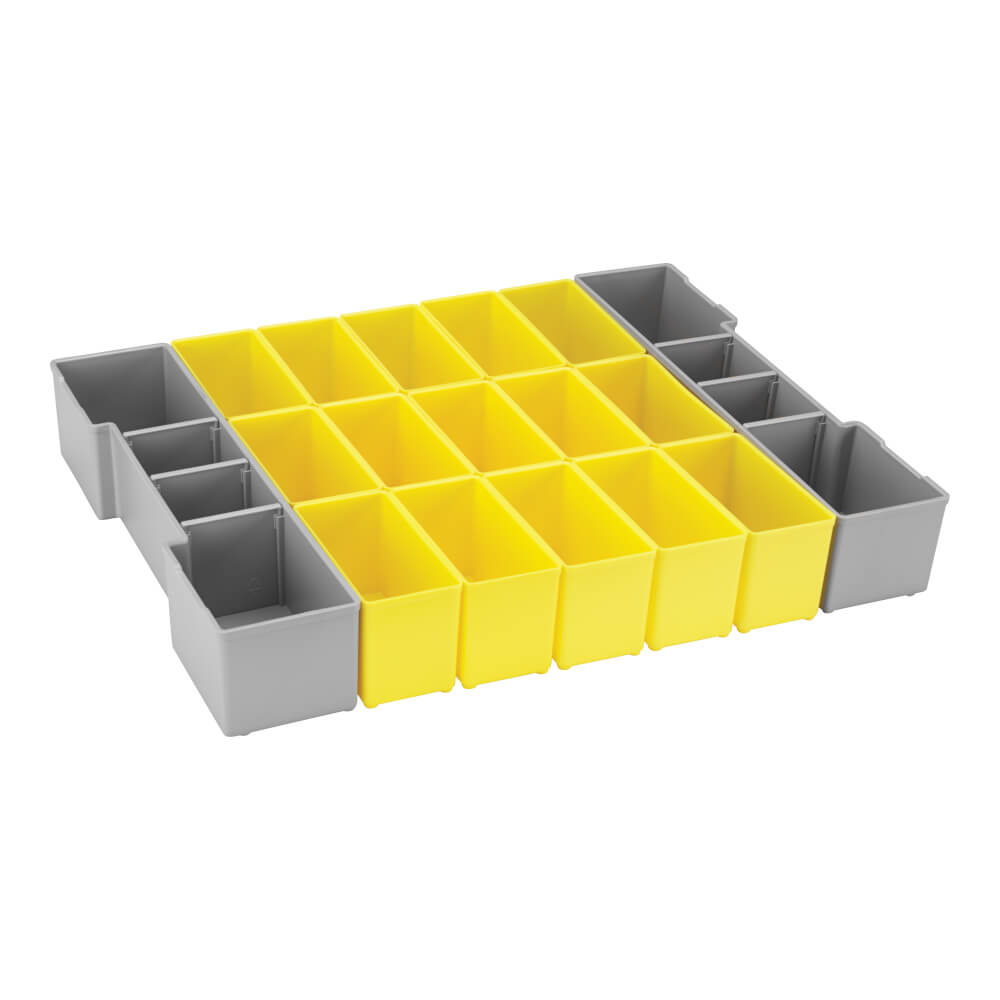 Designed for use with the Bosch Click & Go storage system, this Bosch ORG1A-YELLOW set features 17 modular organizers (in different shapes and sizes) for keeping items neatly stored and easy to find.