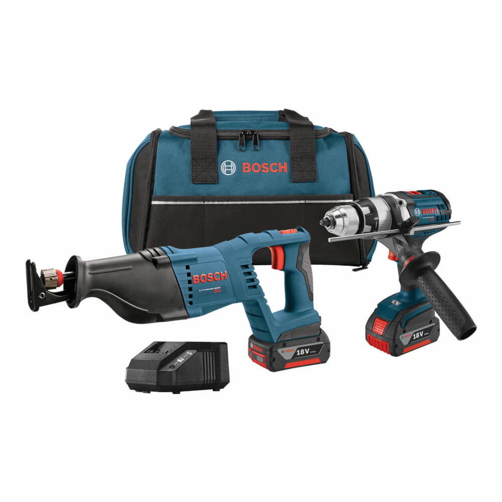 The Bosch CLPK203-181 18 V Cordless Combo Kit includes the Bosch HDH181X Brute Tough™ 1/2 In. Hammer Drill/Driver and the CRS180K Reciprocating Saw.