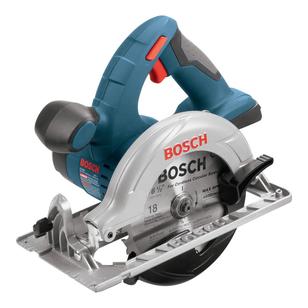 The Bosch CCS180B 18V 6-1/2 In. Circular Saw Bare Tool can easily cut through 2x ("œtwo by") material across entire bevel range. This cordless saw provides a convenient 50° bevel range, which is handy for times when quick bevel cuts are called for in a difficult situations. The easy-to-read depth-of-cut gauge and bevel scale help make accurate cuts simple. Its ergonomic main handle that is angled for ease in pushing the saw forward. The saw includes a simple depth gauge and bevel scale, a dust blower to help keep the cut line visible, and an anti-snag lower guard to ease into the cut. This balanced saw weighs only 6.6 Lbs. (tool only, not including battery). This is a bare tool kit; the battery and charger are sold separately.