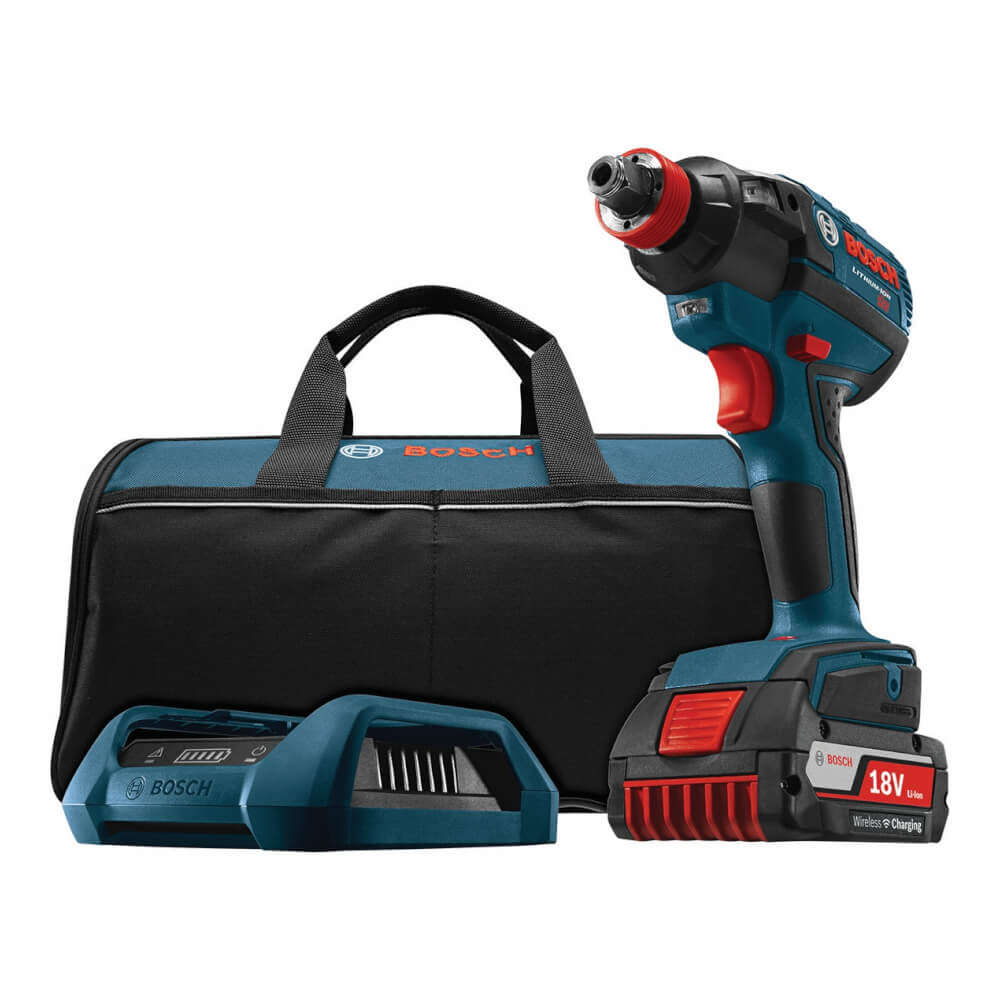 The Bosch IDH182WC-102 18 V EC Brushless 1/4 In. and 1/2 In. Socket-Ready Impact Driver with wireless battery charging to keep the power driving on full. The Socket-Ready adapter makes available a 1/4 In. hex and 1/2 In. square drive in one tool. The wireless charging kit can keep the tool ready while the user's between jobs, and the CoolPack technology offers more run time and twice the life. A Performance Control System provides three speed and torque settings for maximum effectiveness. The tool is powered by a hassle-free EC brushless motor. The hammer and anvil system that delivers maximum impact endurance, and the tool provides superior ergonomics, with the smallest grip diameter in the class.