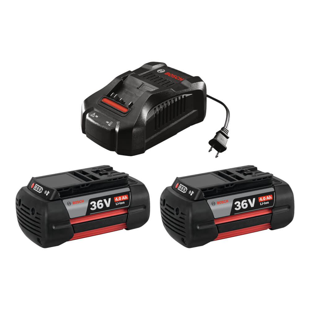 The Bosch SKC36-01 36 V Lithium-Ion battery & charger starter kit features two Bosch BAT838 4.0 Ah 36 V batteries and the BC3680 36 V fast charger. The BAT838 battery delivers 50 percent more runtime than the previous generation 36 Volt battery; when projects are under time constraints, battery runtime can be a difference maker. Bosch's CoolPack technology delivers up to 100 percent more recharge life versus other battery packs. The Bosch BC3680 charger can charge a spent BAT838 battery in 45 minutes, for more productivity and better RYOBI. The smallest and lightest charger in its class powers the cells safely. This unit has battery-protection systems, including trickle charge "“ the first 80 percent is very fast, while the remaining 20 percent of the charge is standard speed. Another protection measure is a cooling fan, which prevents overheating while charging. This charger provides a charging status indicator, and it is compatible with 18 V Bosch batteries as well.