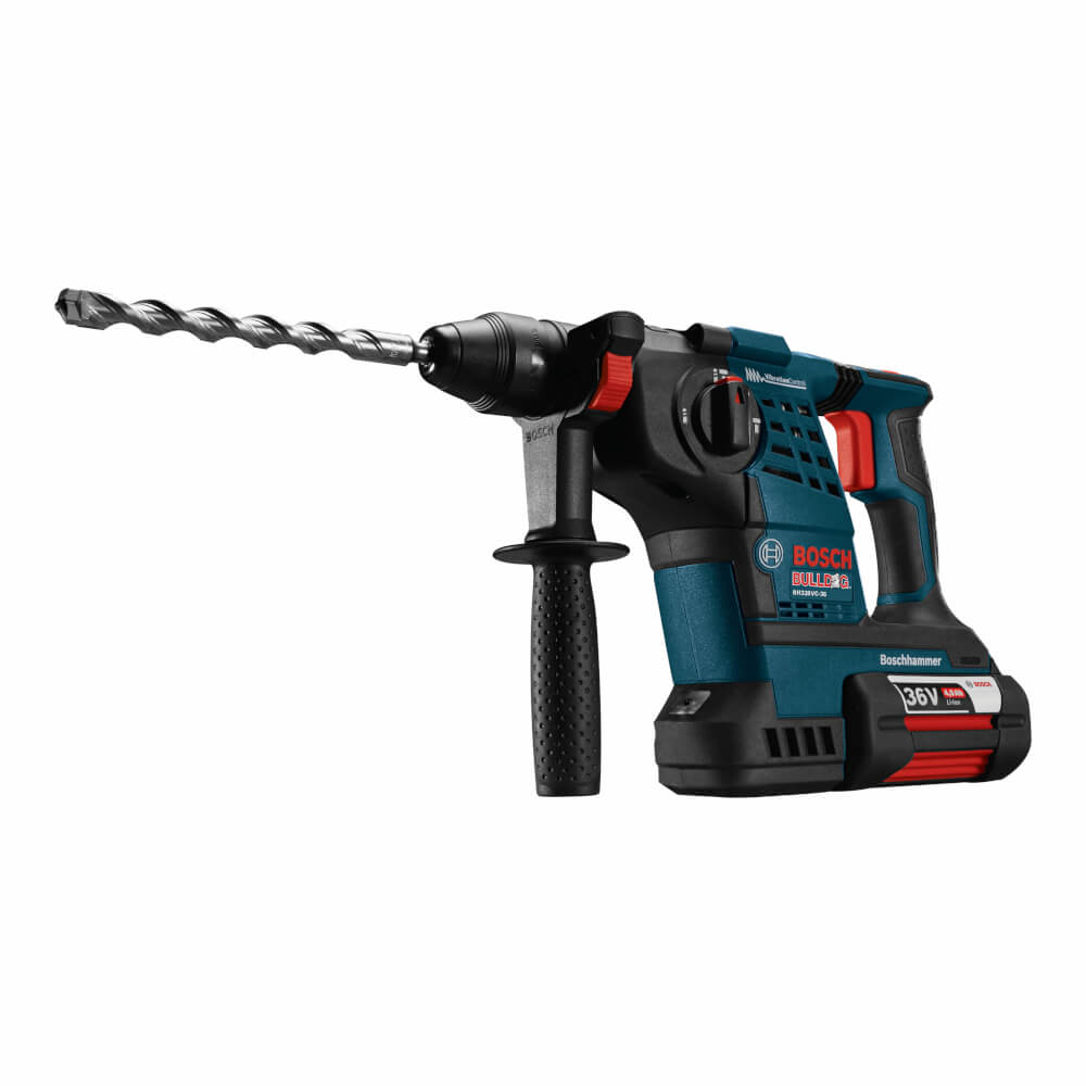 The Bosch RH328VC-36K 36V Bulldog™ Rotary Hammer is a 1-1/8-In. SDS-plus® rotary hammer that provides the power of corded rotary hammers with the convenience of 36V cordless technology. The Four Pole motor delivers 4,100 bpm, and it has Vibration Control™ for additional control while mitigating vibration. For users who are looking for mobility and muscle, this powerful rotary hammer offers 36V power combined with long battery runtime, user comfort and a variable-speed trigger with reversing. This hammer provides Electronic Precision Control™ for smooth starts, Vario-Lock™ positioning to rotate the chisel and KickBack Control to help with bit bind-up situations. It has three modes: rotary hammer, rotation only and hammer only.