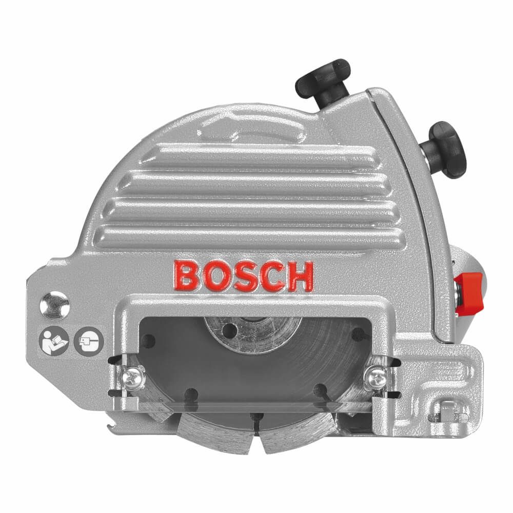 The Bosch TG502 is the new tuckpointing guard for all AG and GWS 4 1/2" / 5" / 6" series grinders. Its tool free installation makes it quick and easy to install and remove. The variable depth adjustment allows the guard to collect dust throughout the duration of the cut, from the initial plunge until the blade is removed from the material. The large viewing window makes it easy to see the line of cut when in operation. The dust extraction port ensures a cleaner work piece and job site when used with a vacuum.