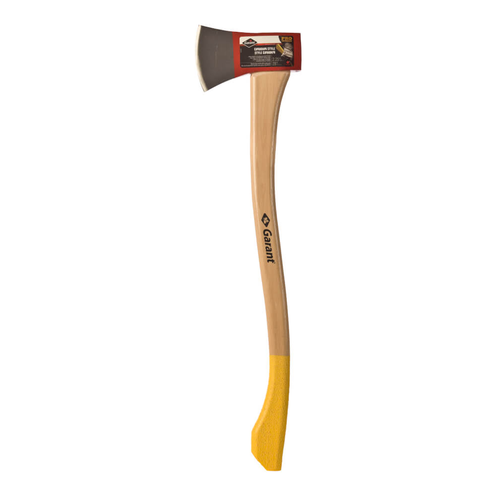 Professional canadian axe, 2.25 lbs drop-forged and tempered steel head, red, head polished on 1/3 for a sturdier look, 28 in. top quality varnished hickory handle with non-slip safety grip for safer handling. American eye. Canadian blade with a very large, thick head, and a large slim cutting edge. Limited lifetime warranty.