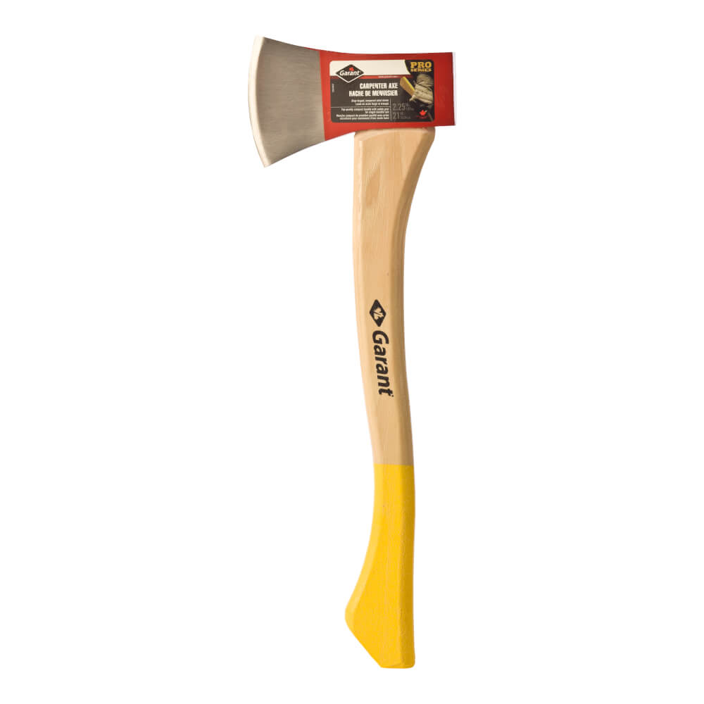 Professional carpenter axe, 2.25 lbs drop-forged and tempered steel head, red, head polished on 2/3 for a sturdier look, 21 in. top quality varnished hickory handle with non-slip safety grip for safer handling, American eye. Smaller axe for one-handed usage. Limited lifetime warranty.