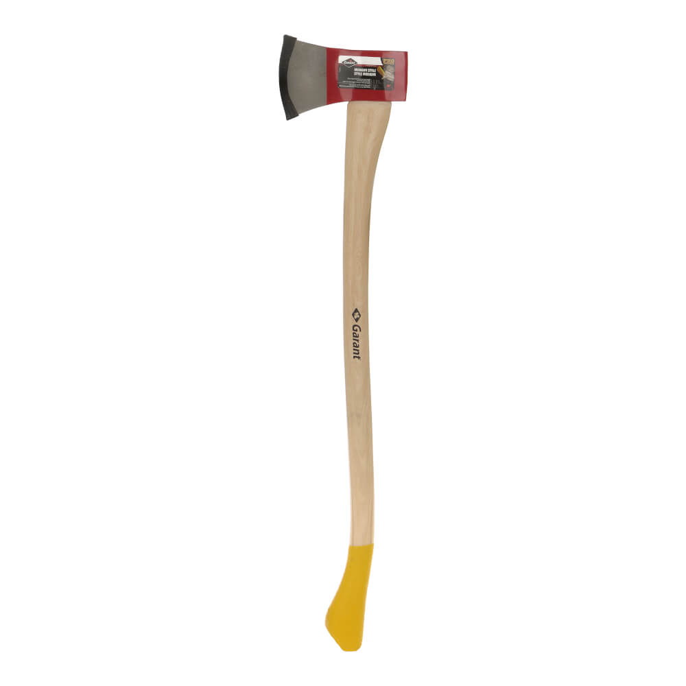 Michigan Axe, 3.5 lbs. Drop-forged and tempered steel head, red, head polished on 2/3 for a STURDIER look, 36 in. top quality varnished hickory handle with non-slip safety grip for safer handling, American eye. Michigan blade with a larger cutting edge, ideal for splitting wood. Limited lifetime warranty.