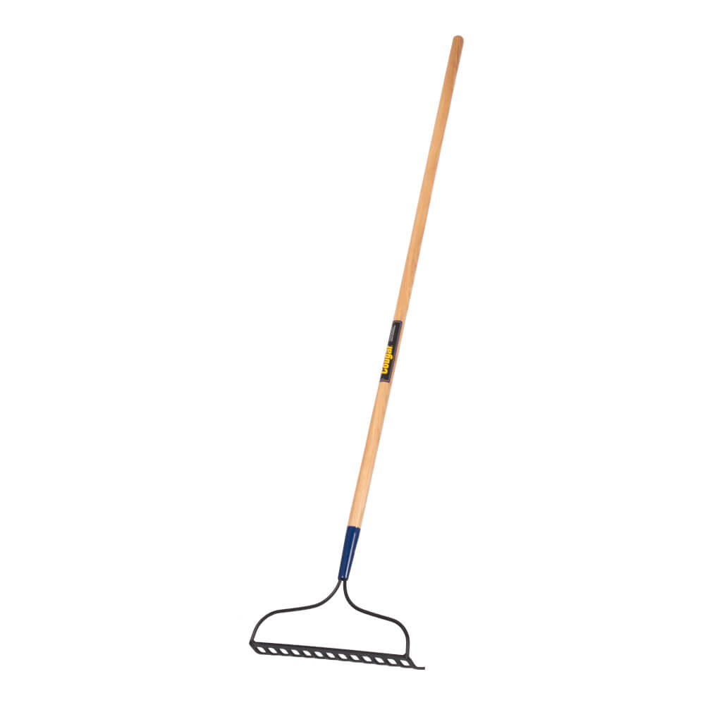 Bow rake, baked enamel head finish, hardwood handle. Great for spreading earth, clearing flower gardens, and loosening soil. Also useful for raking branches.