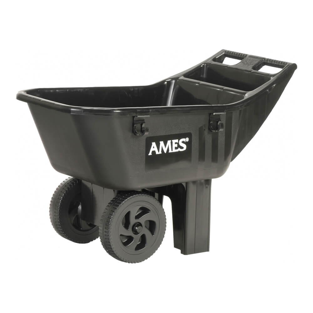 Easy Roller Jr. lawn cart, all-poly construction with tubular steel axle. Extra-wide wheel base. Flat bottom. Recessed tool tray. Tool clips on side. 10 in. (25,4 cm) wheels. 200 lb (90,7 kg) capacity..