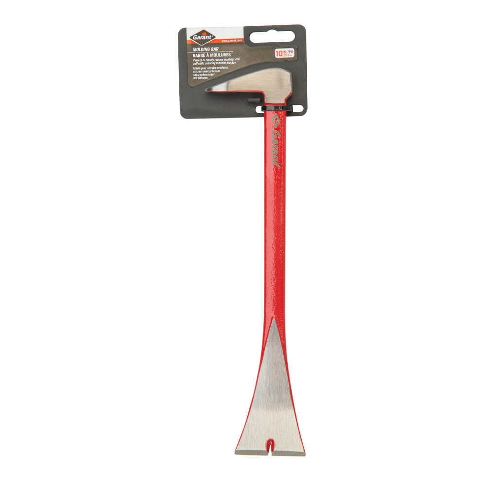 Molding Bar, 10 in. Polished and beveled ends reducing material damage. Slot in blade for removing small nails. Claw with small striking surface allows for precision penetration and ease to be driven under embedded or headless nails. Made of forged and tempered steel. Ideal to cleanly remove molding and pulling nails.