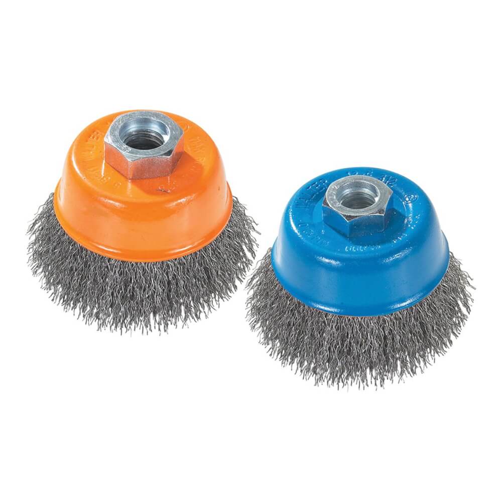 Crimped for light surface cleaning, rust and paint removal, etc. Safety supporting ring controls flaring to extend brush life. Once wires are worn down to the ring, the ring can be removed to expose more wire for extra brush life.