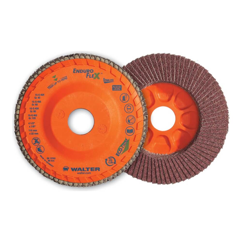 Whether you work on stainless steel, aluminum or any copper alloy the ENDURO-FLEX Stainless flap discs will replace grinding wheelsand sanding discs and provide exceptional cost savings, higher productivity and a more consistent surface finish. Made from natural and sustainable plant fibers, the ECO-TRIM backing can easily be trimmed for higher productivity, maximum operator safety and comfort as well as protect our environment.