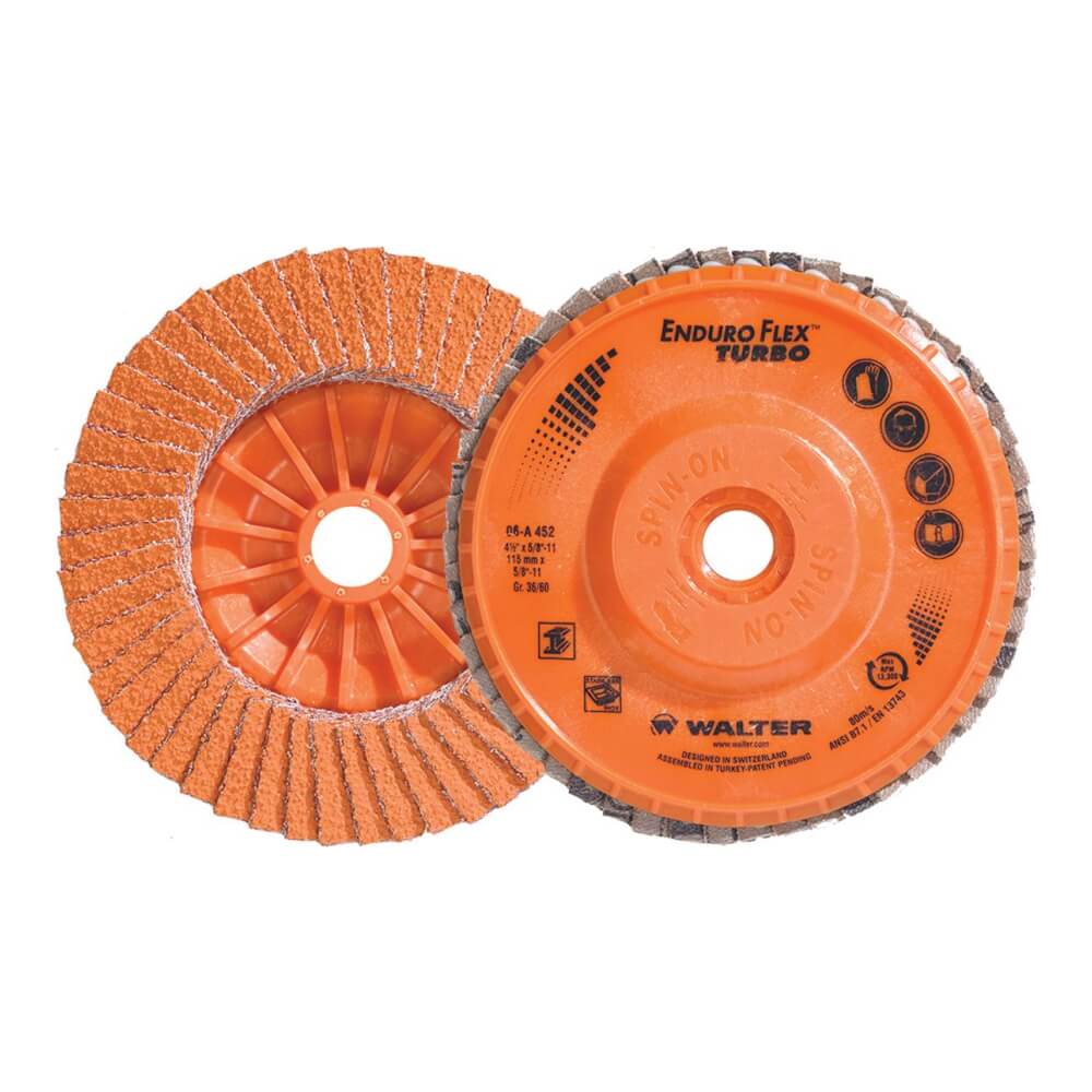 If time is money, then ENDURO-FLEX TURBO™ is worth its weight in gold. This extremely aggressive flap disc removes material like a 36 grit but leaves a 60 grit, paint-ready finish, saving you a valuable step in the finishing process. The innovative backing pad design allows air to cool the work piece, increasing product life and minimizing heat transfer to the surface. Whether you are working with steel or stainless steel, ENDURO-FLEX TURBO™ will help you blend welds and break edges faster, guaranteed.