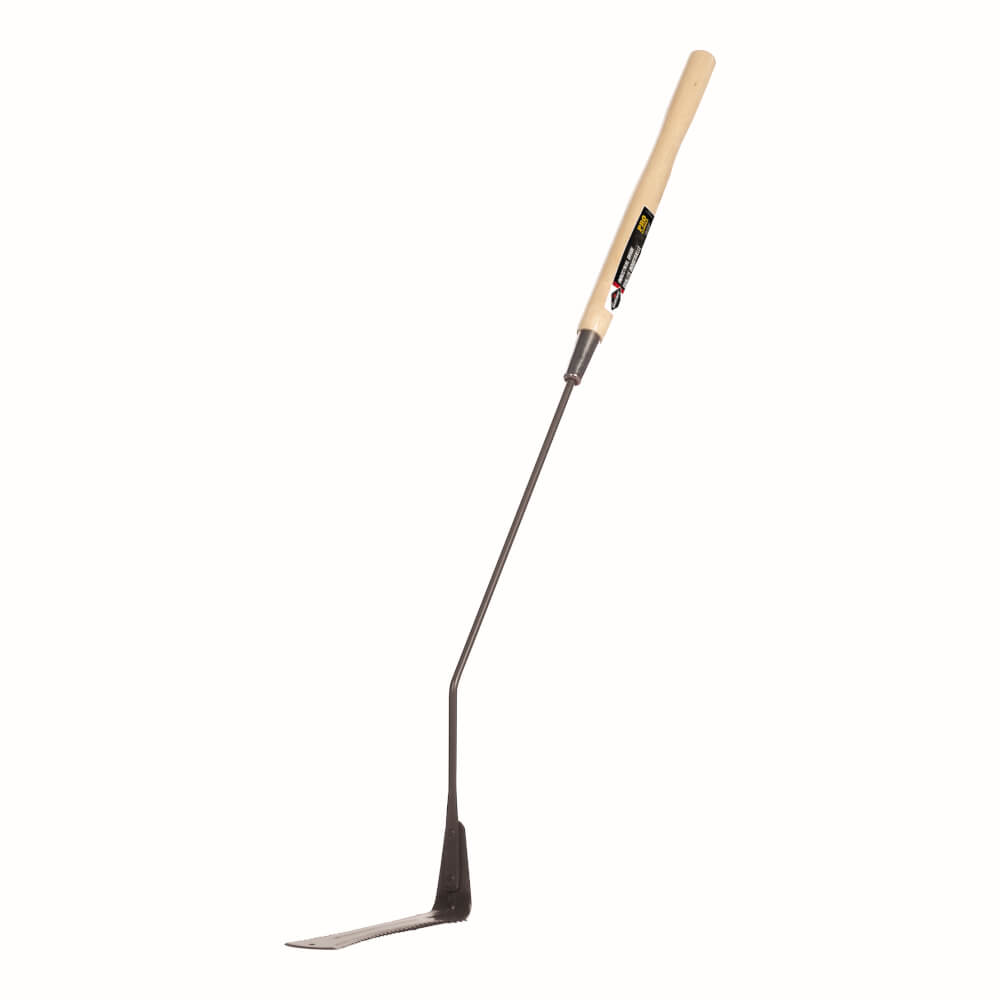 Industrial grade Grass whip, 8.5 in. steel serrated blade securely attached to a metal shaft, shaped hardwood handle. Limited lifetime warranty.