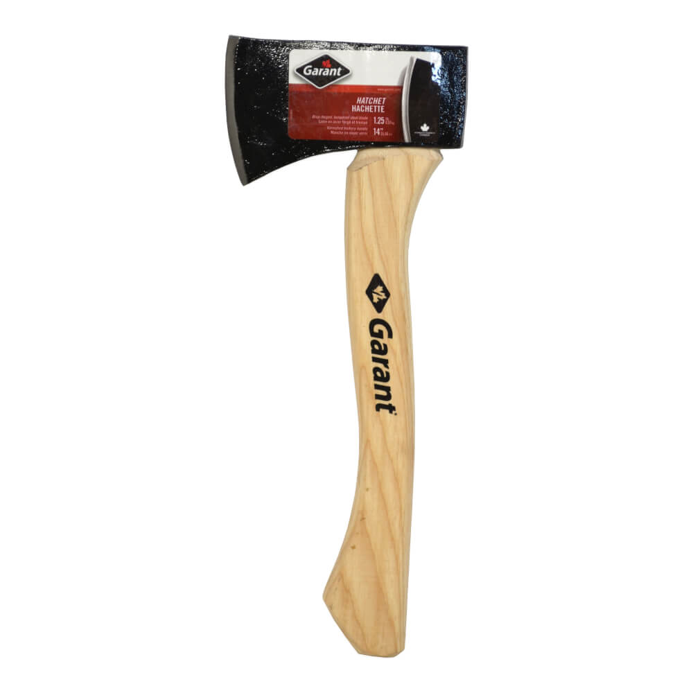 Hatchet for camping, hunting and fishing, 1.25 lbs. Drop-forged and tempered steel head, 14 in. hickory handle.