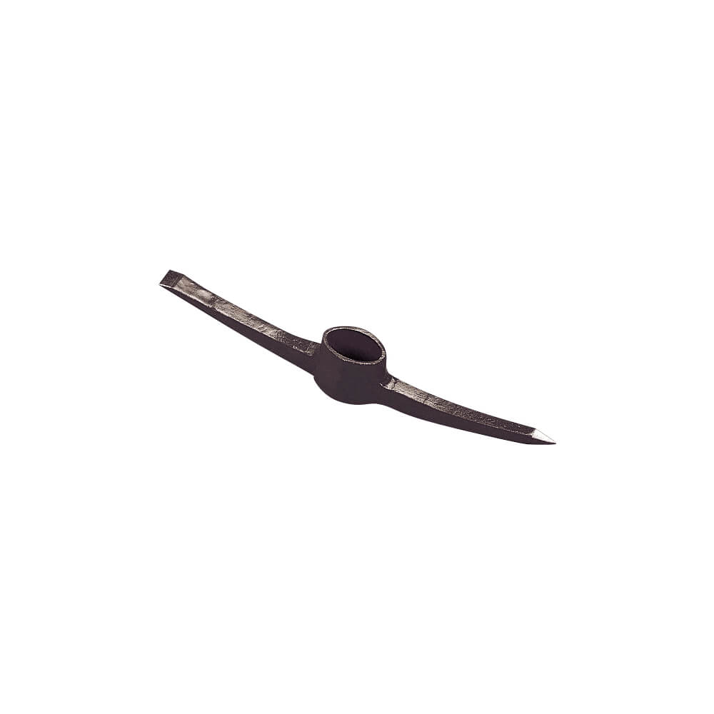Pick and mattock head, forged and tempered steel. Used for digging in clay or packed earth, particulary when long or deep ditches are to be dug..