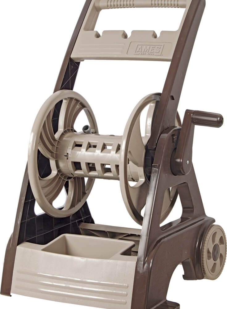 NeverLeak hose reel cart holds up to 250' of 5/8 in. hose . Made of poly with aluminum water system. Handle with nozzle and hose notches and large accessory bin in base for nozzle/accessories. 7 in. (17.8 cm) wheels. Fully assembled. 6 ft (1.83 m) leader hose with brass coupling included. (Hose not included)