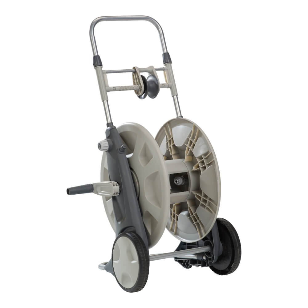 Hose reel cart made of steel and poly with hose guide. Retractable handle to ease transportation on the lawn and easier winding thanks to the hose guide. Capacity : 225 ft of hose 5/8 in.