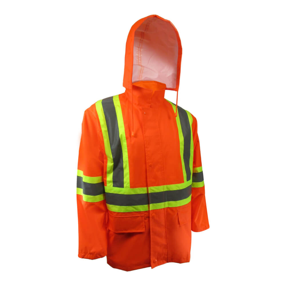 100% waterproof and windproof. Made of 300 denier oxford polyester coated with very flexible polyurethane. Generous sizing. All the seams are sealed with a heat welded waterproof tape. Plastic zipper front closure with external storm flap and rustproof snaps. Ventilation traps on the back. Two large front cargo pockets with flap. Hood that can be rolled up in the collar (with a zipper on the collar). Adjustment cord for the hood.Adjustable cuffs. Two reflective vertical stripes at the front. Two reflective stripes at the back that make an "œX". One reflective stripe at the waist. One reflective stripe on each arm. High resistance thread. Reinforced at all points of strain.ÂCall for pricing