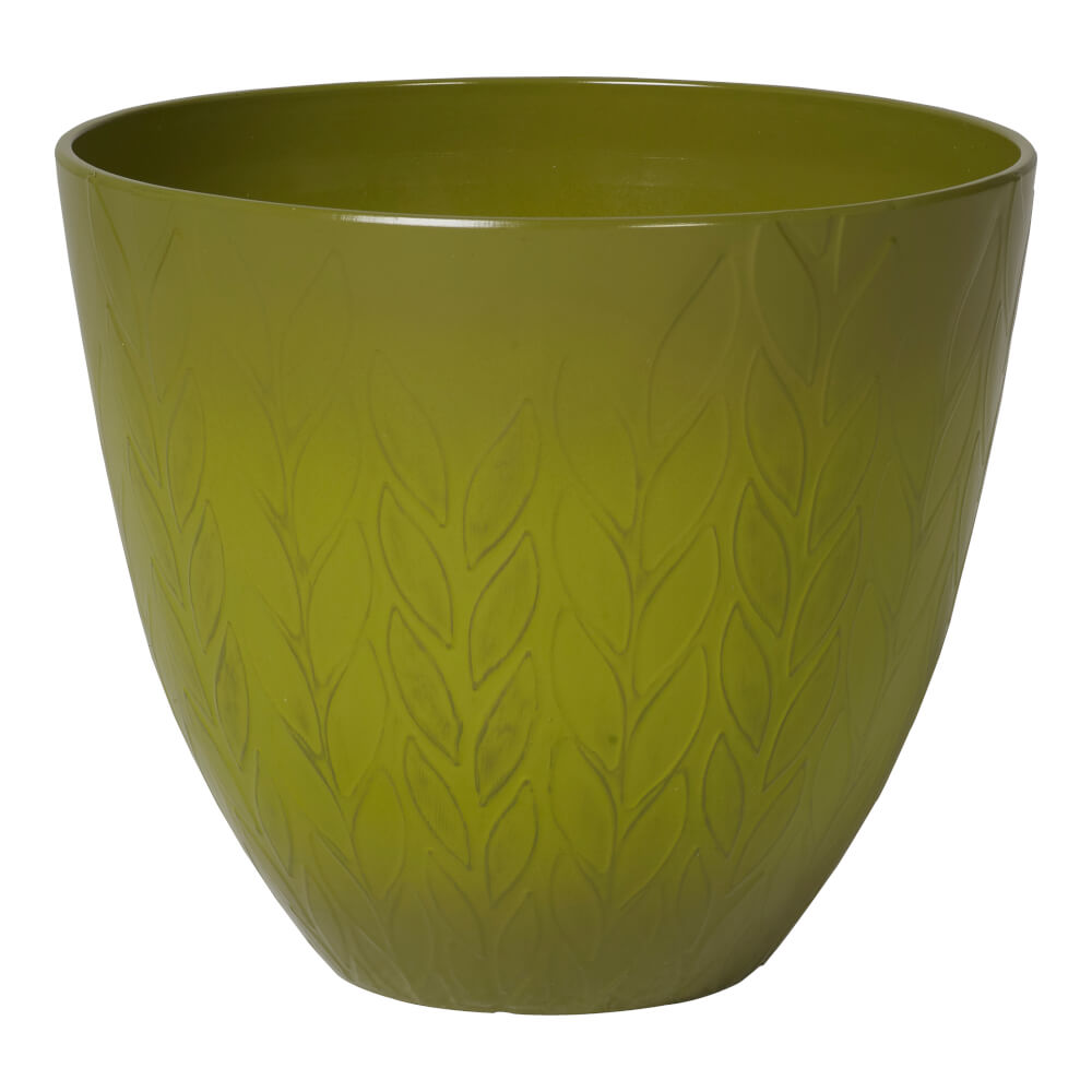 Planter Byrne 10 inches, made of HDR (high density resin), avocado color. Unique embossed leafs pattern. For indoor and/or outdoor use.