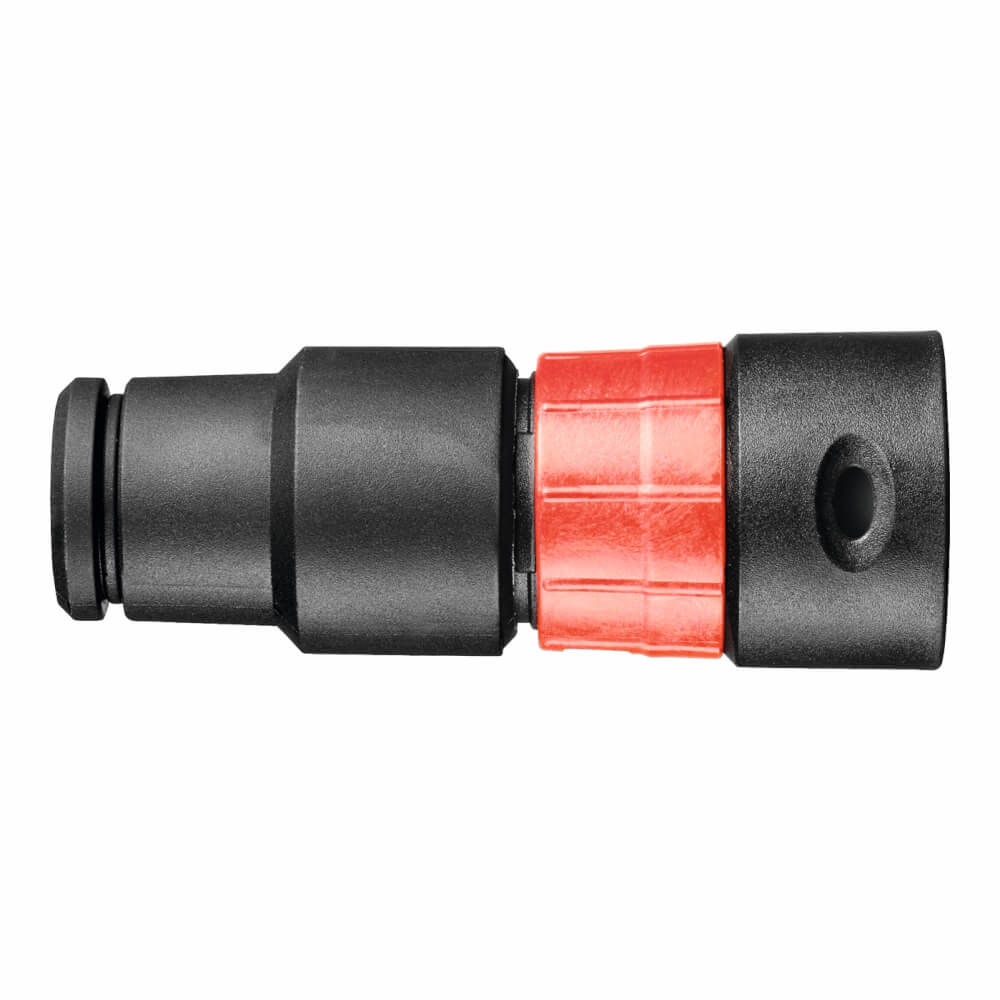 Power tool hose adapter connects to the hose with the Bosch quick click system. The rubber nozzle is sized to be used for a friction fit on nearly all Bosch dust collection attachments. The power tool hose adapter has a slider that is used to regulate air flow for optimal dust collection, specifically for applications like sanding that may require lower suction to prevent the tool from sticking to the work piece.
