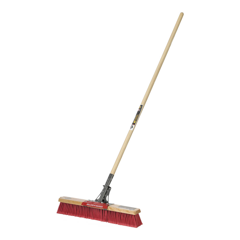 Industrial grade Multi-surface Pushbroom with scraper for indoor and outdoor use. 24in brush riveted and screwed for maximum reinforcement. Tempered steel bracket, formed and welded for more sturdiness. Premium varnished ash handle. Perfect for sweeping and scraping dried or sticky debris on concrete and asphalt. Limited lifetime warranty.