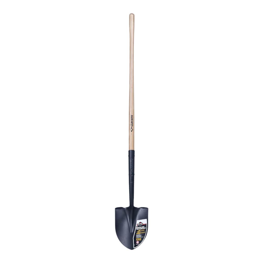 Industrial-grade round point shovel, hollow back tempered steel blade with a 5 in. extended socket (providing an overall socket length of 16 in.) : more wood and more steel for maximum power and durability, forward-turned foot steps , 48 in. premium varnished ash long handle and industrial double rivet assembly for more strength. Perfect for heavy-duty jobs. Limited lifetime warranty.