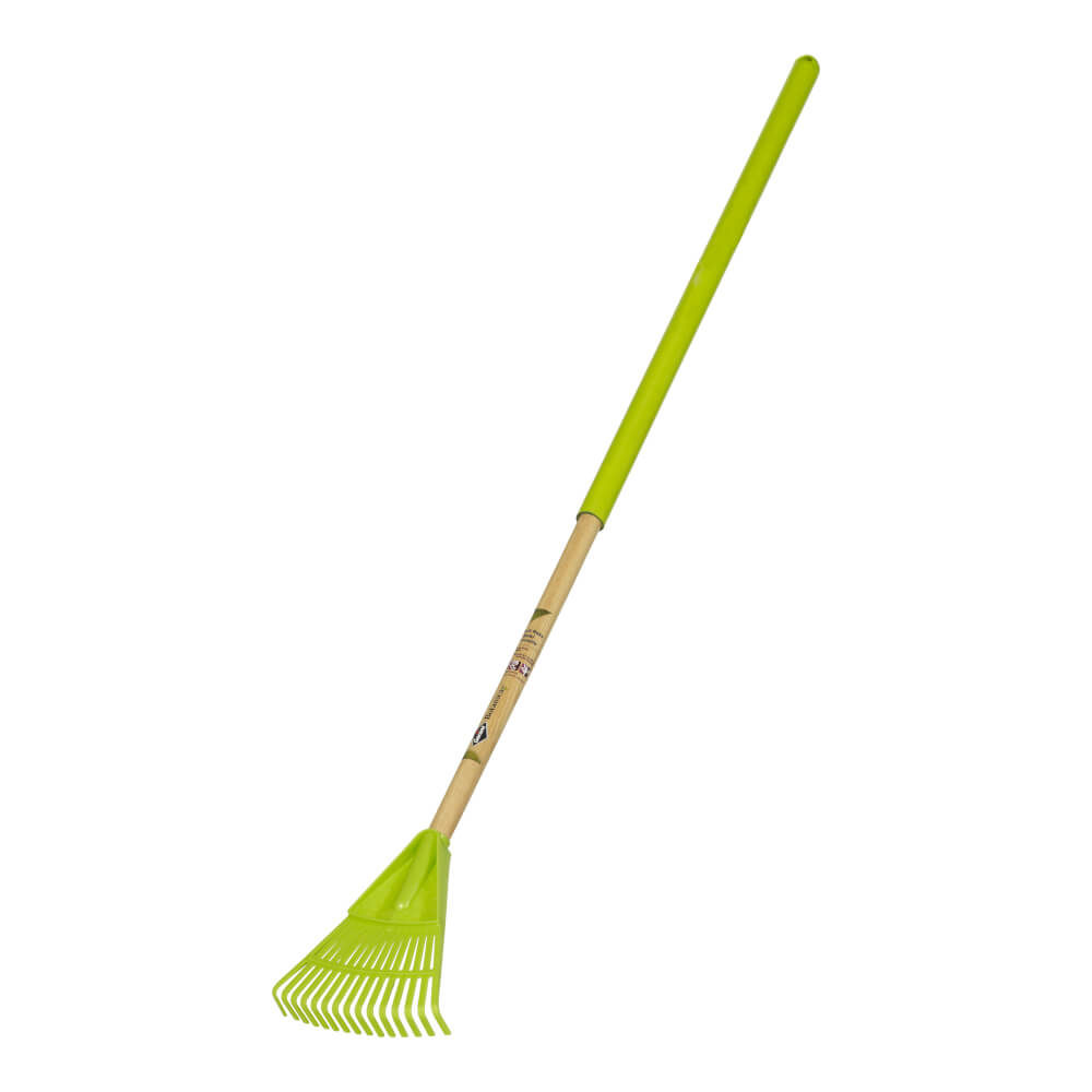 Poly shrub rake, light and durable, 15 tines, 8 in. (20.3 cm) head width, ash handle. Its narrow head makes it a very handy tool ideally suited for removing leaves and branches from rock gardens, flowerbeds and under hedges. Ideal for large gardening places..