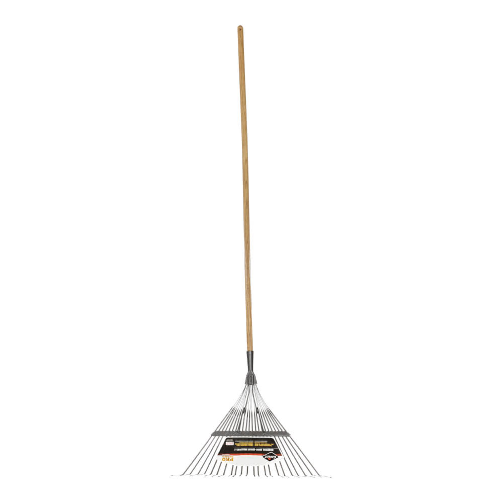 Industrial grade springback lawn rake, 24-inch tempered steel head with 22 tines, flexible reinforcing bar and socket with full welded plate to back for maximum sturdiness, premium varnished wooden handle. Ideal for grooming lawns in the spring and raking cut grass. Back spring providing additional rigidity for deep-down grooming. Limited lifetime warranty.