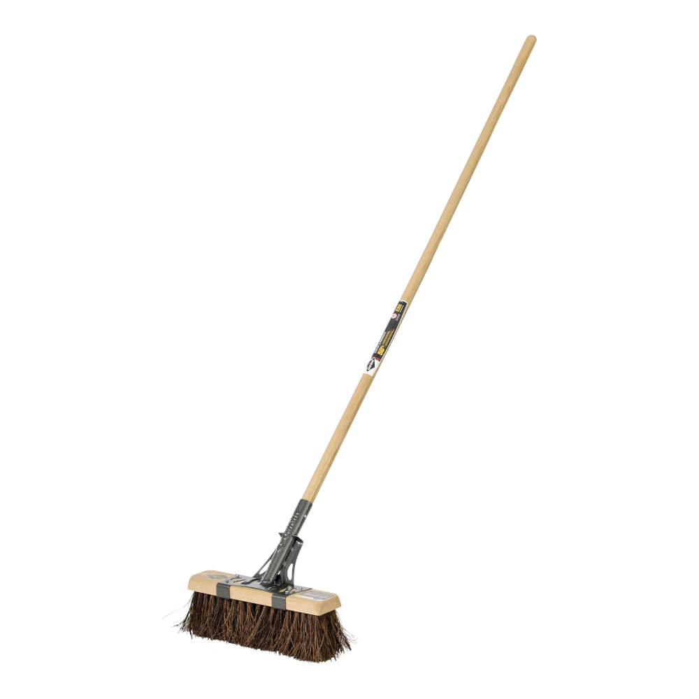 Industrial grade street/stable broom for extra-rough surfaces. 14" brush made of palmyra fibers, heat resistant. Tempered steel bracket, formed and welded for more sturdiness. Premium varnished ash handle (1-1/8" x 60"). Perfect for sweeping up heavy debris. Limited lifetime warranty.