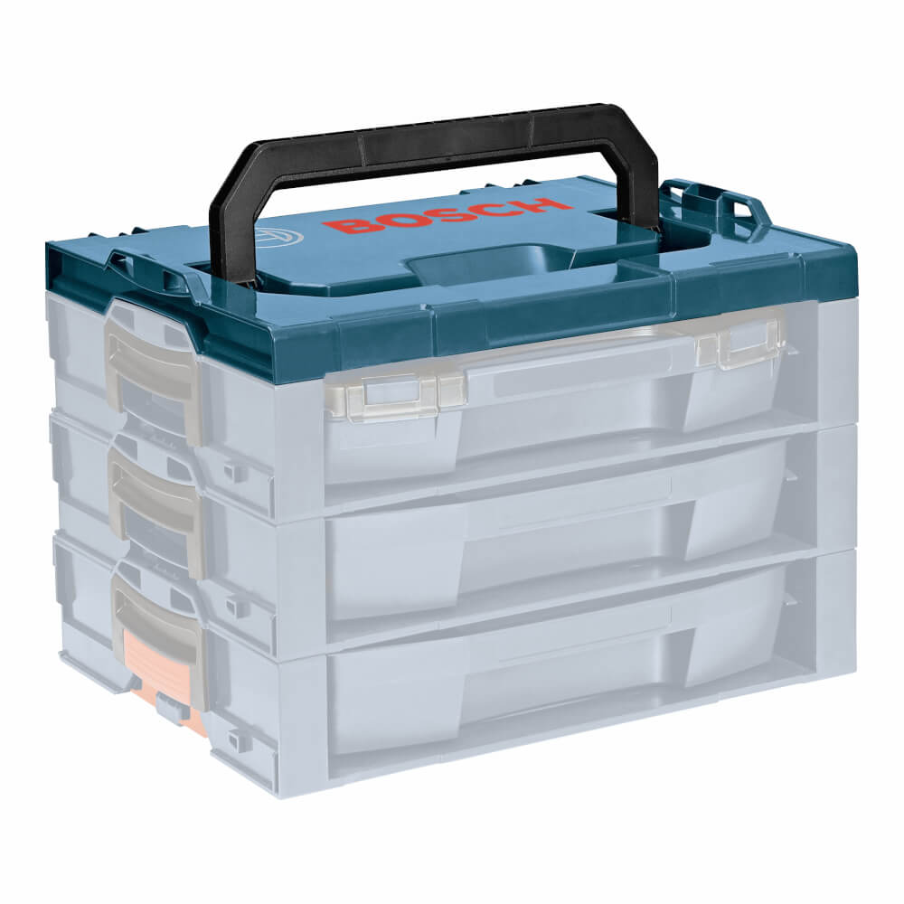 The Bosch L-RACK is a customizable expansion option for the Click & GO system. Users can now choose to add new L-RACK drawers, i-BOXX53 trays and organizer sets to expand their very own customized storage, organization and transport solution. Add a few l-racks to an L-BOXX (1, 1 A, 2, 3, 3D or 4) to build specific Tool Kit or stack them high or side-by-side to create a stationary storage system in your shop. The entire system uses the same single-click stacking technology, so you can keep organized and mobile. The l-rack-t is the top handle that attaches to the l-rack-s. This top handle provides easier portability to the stacked shelves. Combine the l-rack-t with multiple l-rack-s shelves to create a mobile organization structure to fit your needs.