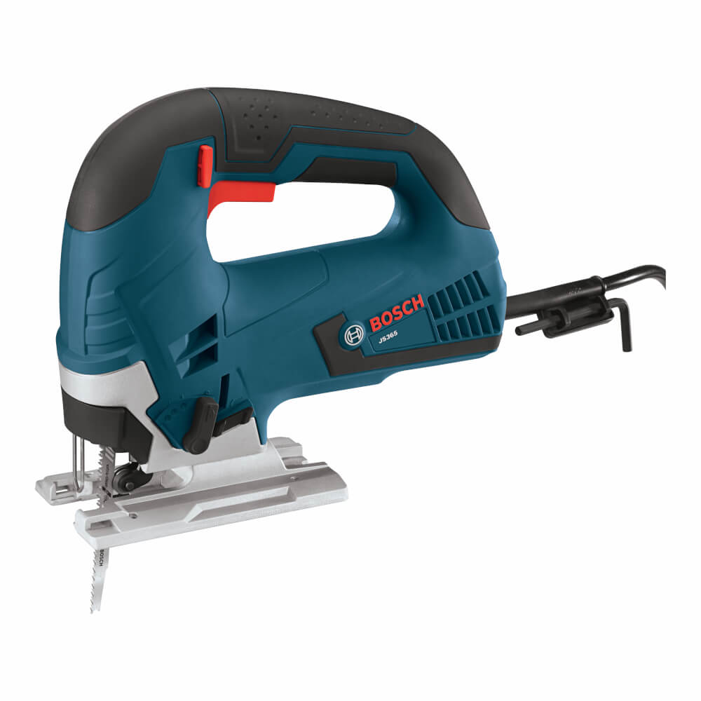 The Bosch JS365 Top-Handle Jig Saw provides plenty of power coupled with outstanding handling and accuracy. Finish carpenters and kitchen and bath installers will appreciate the powerful 6.5-amp motor and variable-speed control, making this saw an excellent choice for curve-cutting. A dial on the back of the tool controls the maximum speed; the accelerator trigger regulates the operating speed. This jig saw is engineered with a precision-machined plunging mechanism and low-vibration design, delivering enhanced accuracy and extremely smooth operation. Also, it was designed with soft grip areas for solid handling. The sturdy die-cast aluminum footplate includes a steel insert and on-board storage of bevel hex key. The JS365's multidirectional blade clamp delivers superior grip of T-shank blades (but it does not accept U-shank blades). The toolless T-shank blade-change system affords fast blade insertion and removal. It has a dust blower (with an on/off switch) for max cut-line visibility.