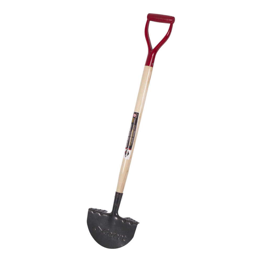 Industrial grade turf edger. Sharpened tempered steel blade for easier soil penetration. Premium varnished handle with a sturdy steel D-grip. Ideal for edging around flower beds and trees. Limited lifetime warranty.