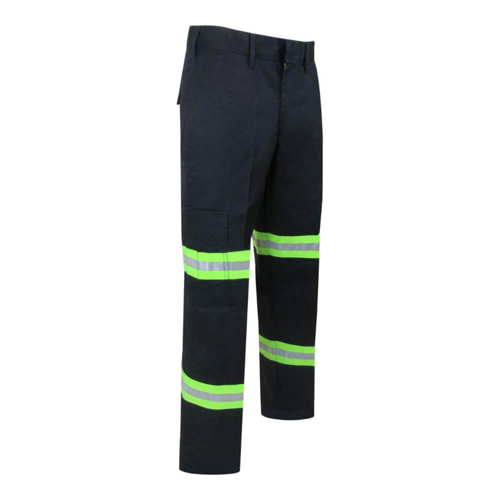 Reflective stripes at legs. Low rise. Relaxed fit. Pre-shrunk 65% polyester - 35% cotton, 7 ¾ oz, precured. Stain resistant. Permanent press. Two double thickness front swing pockets. Two rear pockets. Seven wide belt loops. Lined waistband. Hook and eye closure on the waistband. Front with brass zipper closure. Fly. High resistance thread. Reinforced at all points of strain.Call for pricing