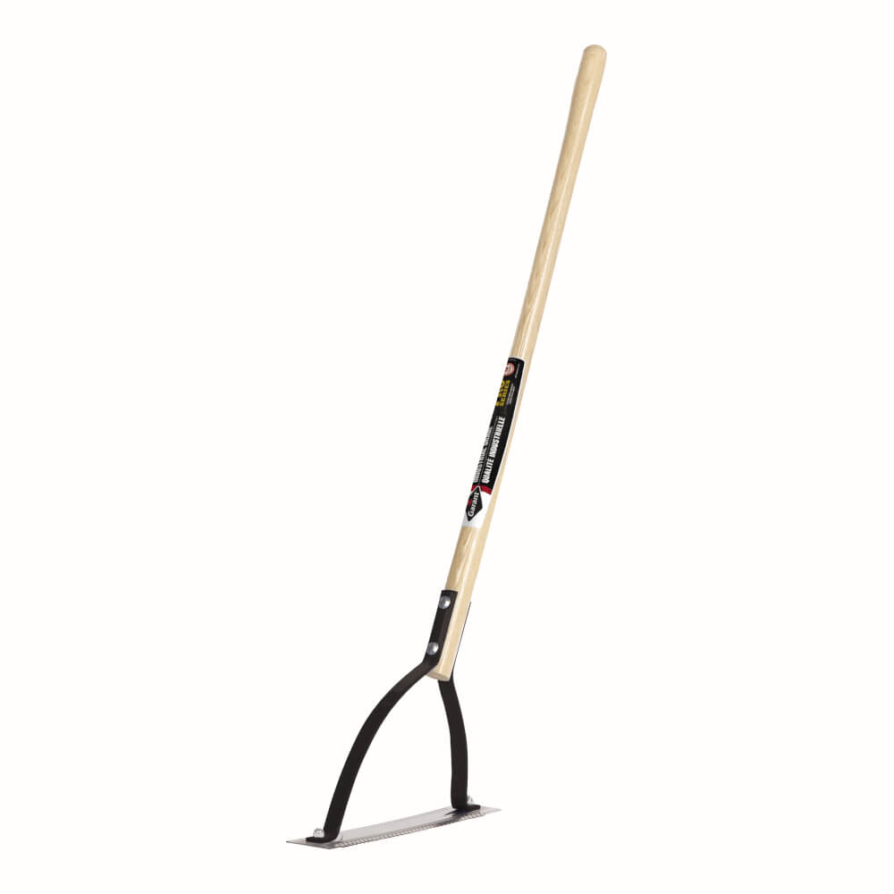 Industrial grade weed cutter, 14.25 in. steel serrated blade securely attached to a metal bow, shaped premium ash handle. Limited lifetime warranty.