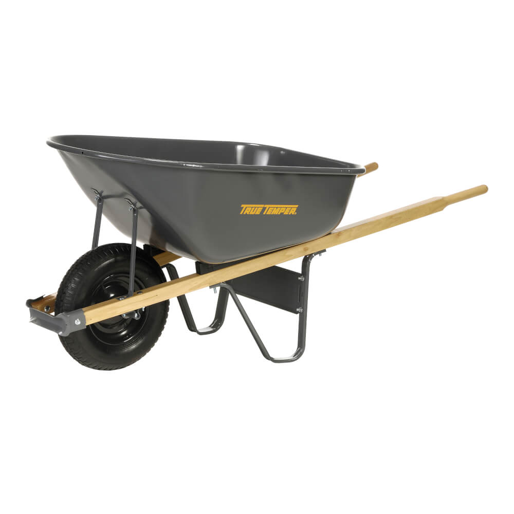 Contractor wheelbarrow, 6 cu. ft. heavy gauge seamless steel tray, front tray braces, 60 in. square (1.625'' x 1.625'') hardwood handles, H-brace, 16 in. (40.6 cm) wheel assembly with pneumatic 2-ply tire, a 5/8'' (1.6 cm) steel axle and powder metal, oil impregnated steel, bearings. Ideal for homeowners, landscapers and light construction work. Maximum capacity: 270 lbs (122.5 kg).
