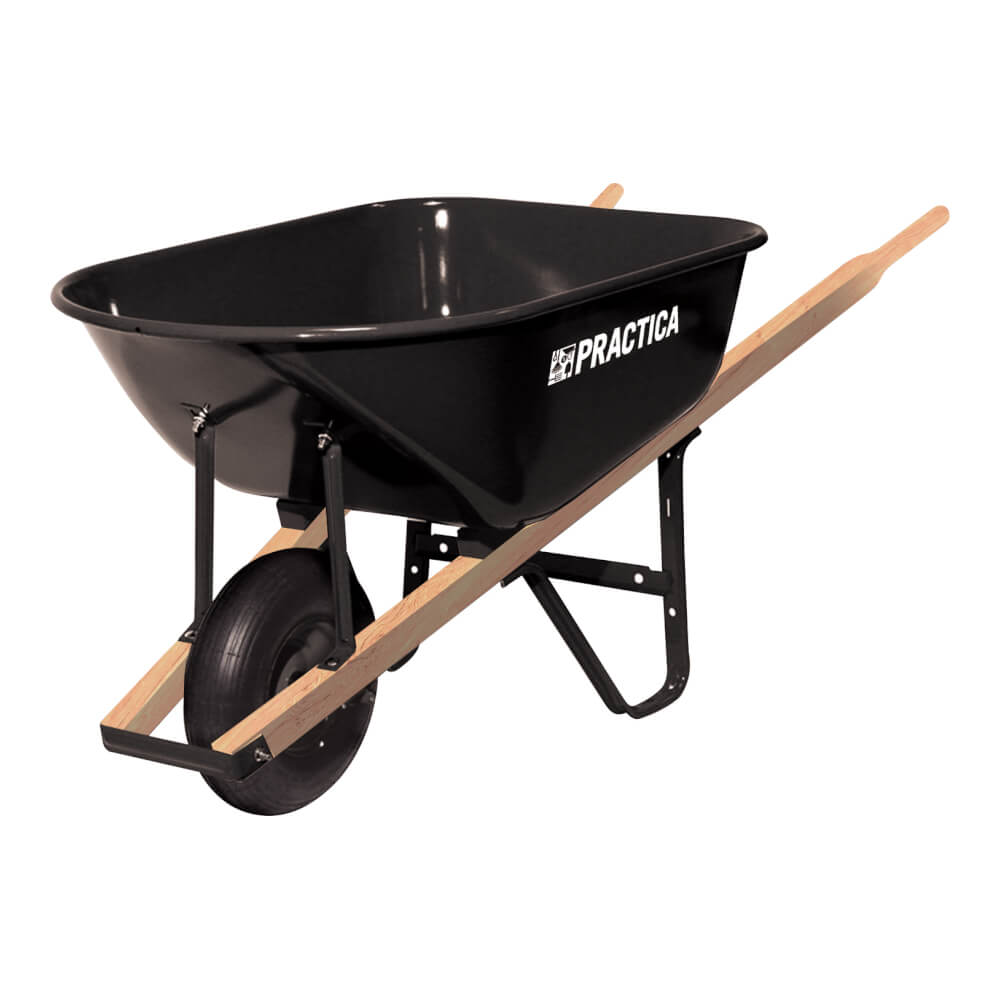 Homeowner grade wheebarrow, 6 cu. ft. seamless steel tray, 55.5 in. square (1.625'' x 1.625'') hardwood handles, front tray braces, 2-ply 14 in. (35.6 cm) pneumatic tire with inner tube, 5/8'' (1.6 cm) steel axle with nylon bearings. Just the right size for tackling all sorts of jobs around the house. Maximum capacity: 200 lbs (90.7 kg).